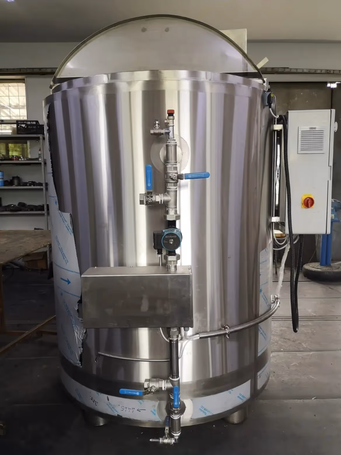 Duplicator for honey is insulated with mineral wool and covered with an insulation jacket. It is also equipped with a release valve, motor reducer mounting plate, motor reducer, anchor-gate type agitator, frequency regulator, temperature sensor connector, and two semicircular protective lids. Duplicator is heated with electric heaters. It also contains a control box with control units.